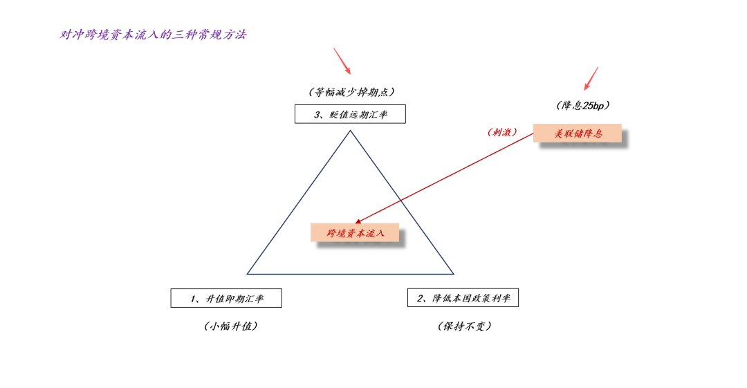 如上图所示,美联储降息会导致我们有增量的跨境资本流入,为了保持金融系统的内外平衡,国内有3种常规对冲方法: