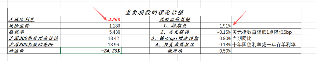 上表为沪深300指数理论估值模型,贴现率50bp的降低会让沪深300指数的理论估值提升大约8.5%。这导致了沪深300指数实际估值相对于理论估值的折价进一步大幅提高,目前,已经拉高到24.2%。