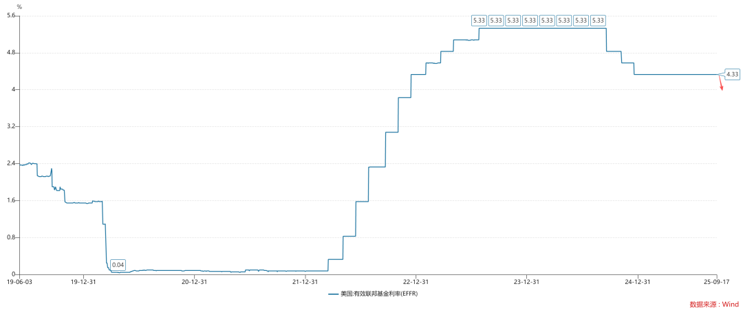 北京时间9月18日凌晨,美联储宣布降息25bp,联邦基金利率进入【4.0%,4.25%】区间。如下图所示,有效联邦基金利率也将从4.33%下行至4.08%。